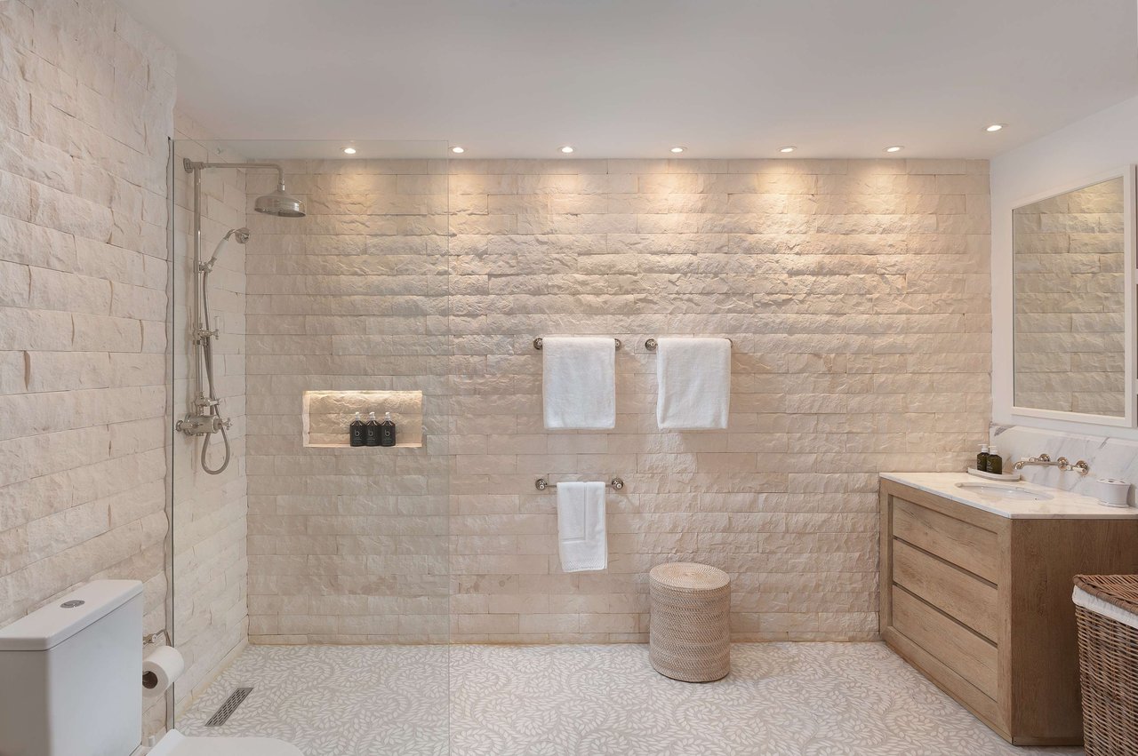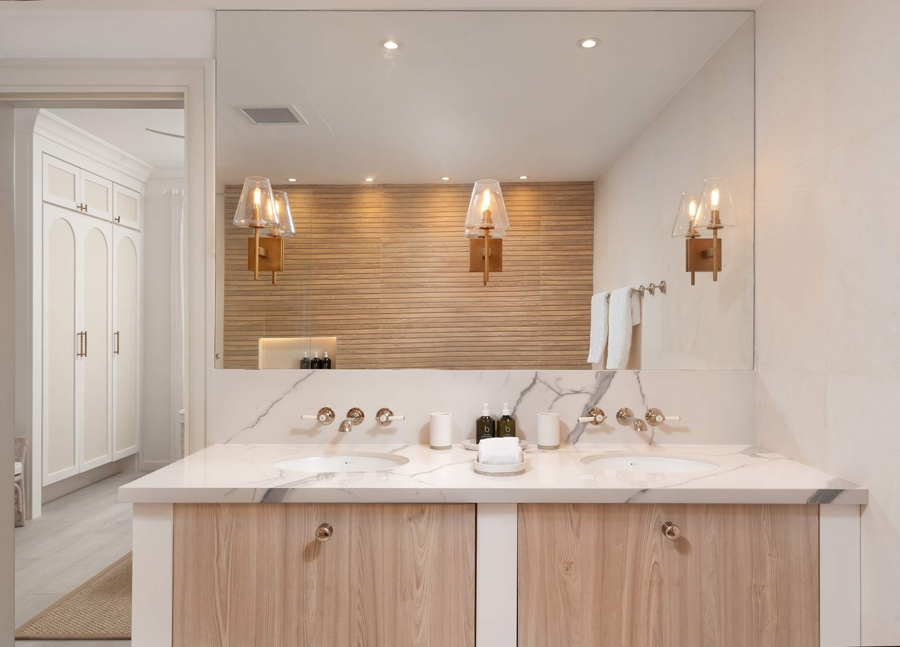 The master suite is a serene retreat with wood paneling, bespoke closets, and a dedicated makeup vanity. The en-suite bathroom showcases hand-cut white marble floors, handmade bleached teak, his & her vanities, and an oversized, walk-in glass shower with a natural limestone backsplash. Both guest bedrooms offer private balconies and en-suite bathrooms featuring textured tiles, and glass showers, with one boasting a double vanity.